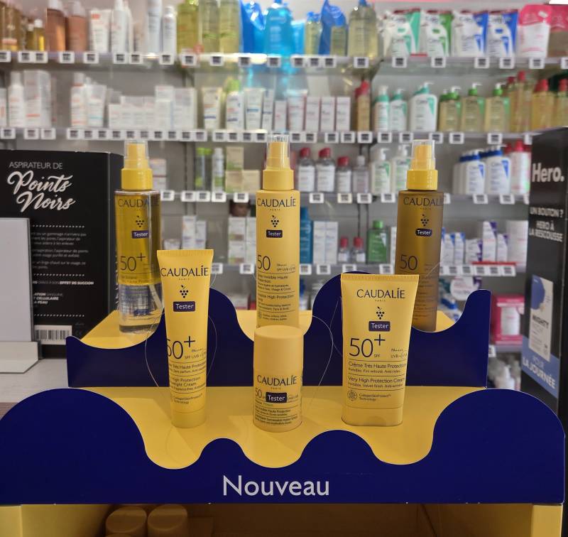 La PHARMACIE DES ARENES propose la routine solaire Caudalie formulée avec le Brevet Anti-Taches Polyphénols de Raisin qui prévient et atténue l'hyperpigmentation induite par les UV. À Toulouse, nous recommandons cette gamme certifiée Ocean Protect avec des filtres solaires respectueux des océans et une très haute protection SPF50+ à large spectre UVA/UVB.